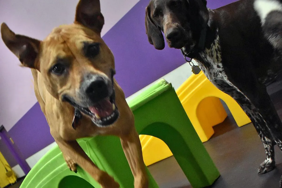 Safety is our top priority. Each dog completes a comprehensive behavior assessment before joining daycare, and all playgroups are limited to 10–12 dogs per trained staff member. Our team is Pet CPR and First Aid certified, and we maintain strict cleaning protocols and health requirements for every guest.